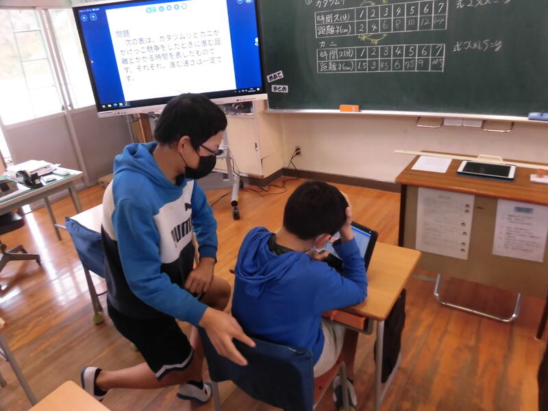 6年生は教科書の内容を一通り終えているので、これまで学習した内容の活用や総復習に取り組んでいます。今回は、スクラッチを利用して比例のグラフを描くというものです。プログラミング学習の一環という位置づけにもなります。