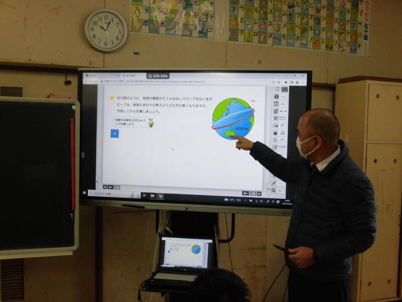 【5年】適用問題で本時の学習のおさえをします。地球の大きさの規模になっても、1mの違いは6.28mの円周の違いしかないことをおさえました。