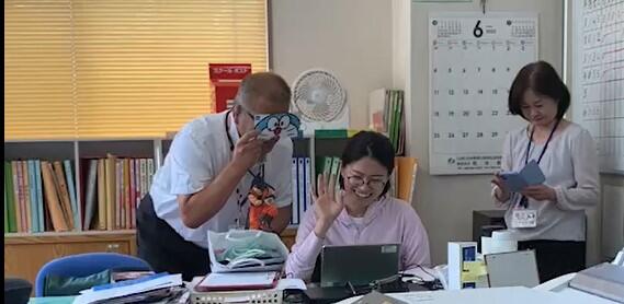 いつも背後から笑いを取りにいく“悪乗り”が過ぎる校長です・・苦笑。これまでがいつも「くまモン」を抱いての登場ばかりでしたので、今日はドラえもんのお面+ドラゴンボール(孫悟空)でアピールしました!気のせいかもしれませんが、(日野)のI先生が「校長先生、ステキです!」と言われたのが聞こえました。もしかすると私でなくて(日野)斉藤校長のことだったのでしょうか?さて、真相はいかに!!?