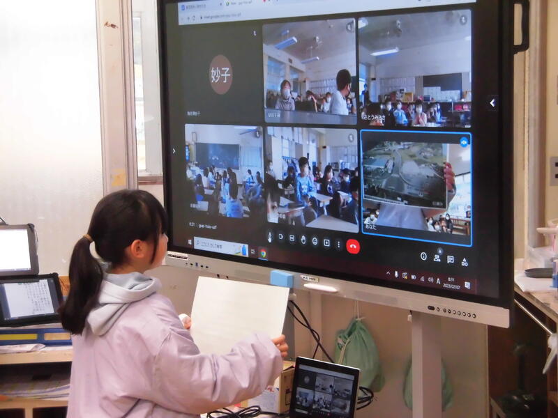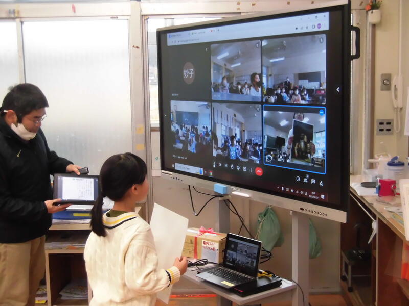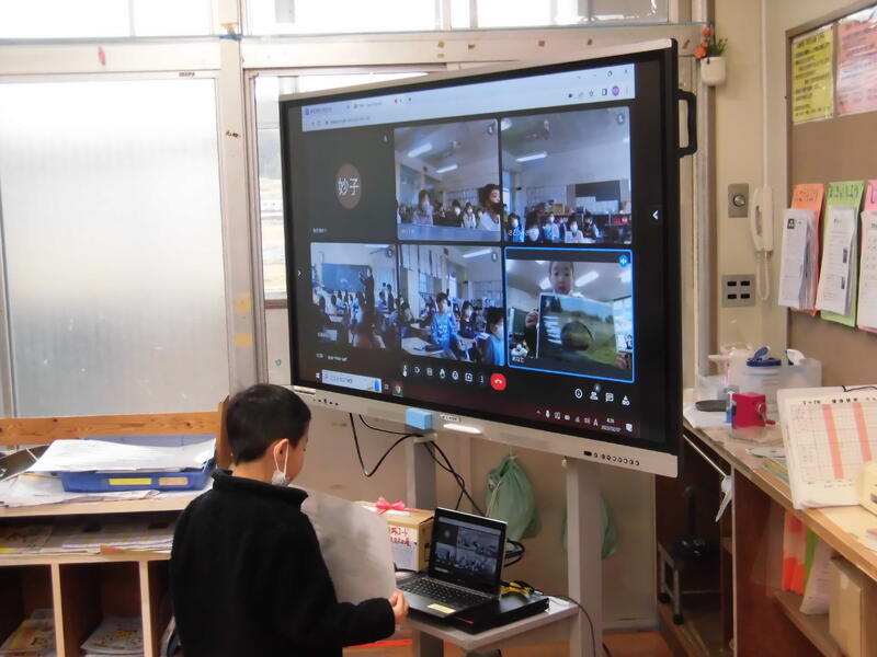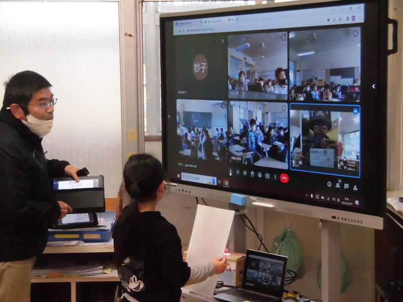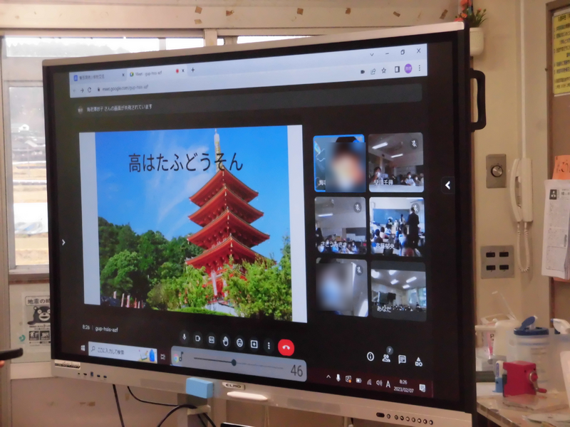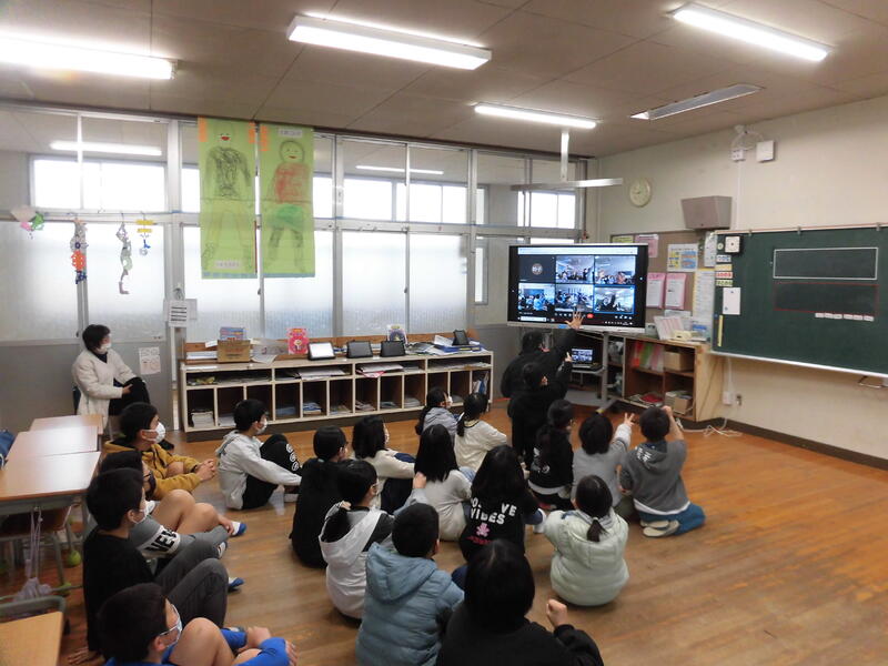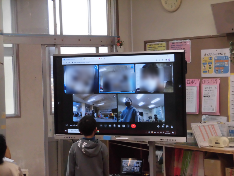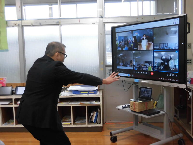 本家本元?の(山都)校長の「こ・ん・に・ち・はー」で交流はスタートしました。リモートアルアルで、カメラの前の校長とモニターに映る(右下の画面)校長の動きがずれています。校長の声が大き過ぎたようで、教室から離れた職員室まで聞こえていたとのこと(笑笑)「体育館バージョン」で言ってしまったようです・・。