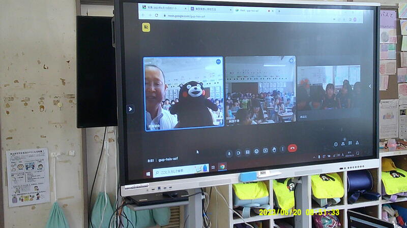(日野)斉藤校長先生・・・1年生にとっては初めての出会いです。本校からプレゼントしたくまモンを持参しての自己紹介です!