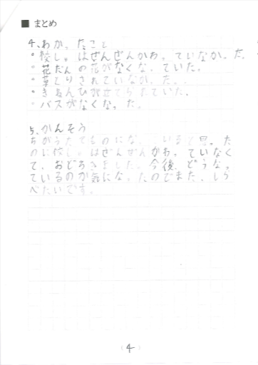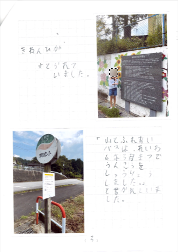 中には、夏休みの宿題を提出している児童がいますが、今日、学校を回っていたところ、2年〇組の〇〇〇〇さんに話しかけられ、夏休みに山都・潤徳小に行ったことを自由研究にまとめたとのことです。(〇〇さんのご家族は、昨年末にも山都・潤徳小に行っているのですが、年末の閉庁期間だったため、池部校長先生にお会いできなかったと聞いています。)