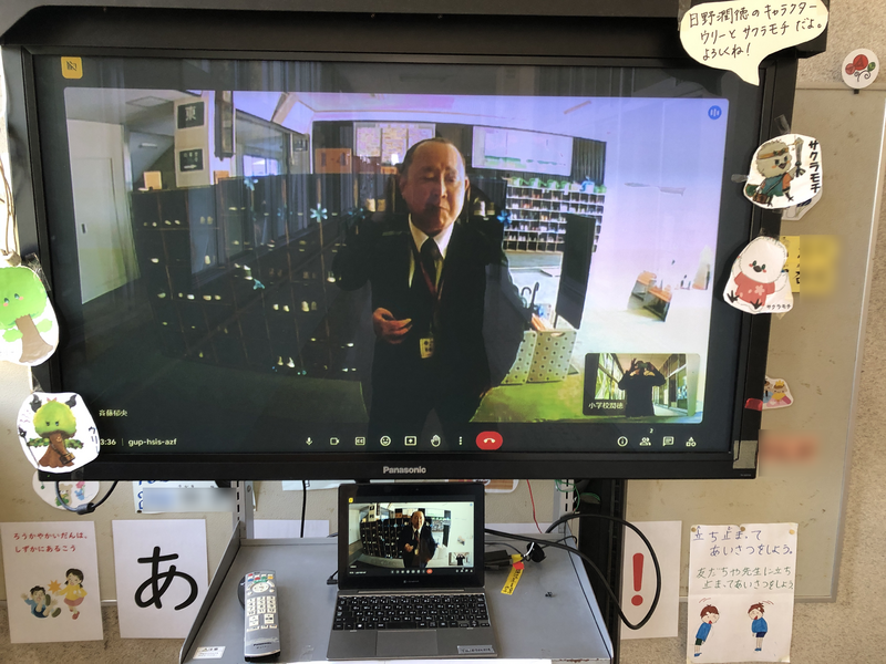 斉藤校長先生から「モニター前に来て頂けますか?」と連絡が入りました。もちろんこれは、改めてつなげなくても、つながっているものを使っちゃえ!精神です笑笑。