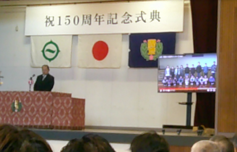 150周年記念式典の様子を動画に撮っていましたので見せました。斉藤校長の式辞はほぼすべて見せました。話の中に本校との交流をしていることについても述べられ、本校から送った150周年を祝う動画を流していただいたということを知らせたかったからです。