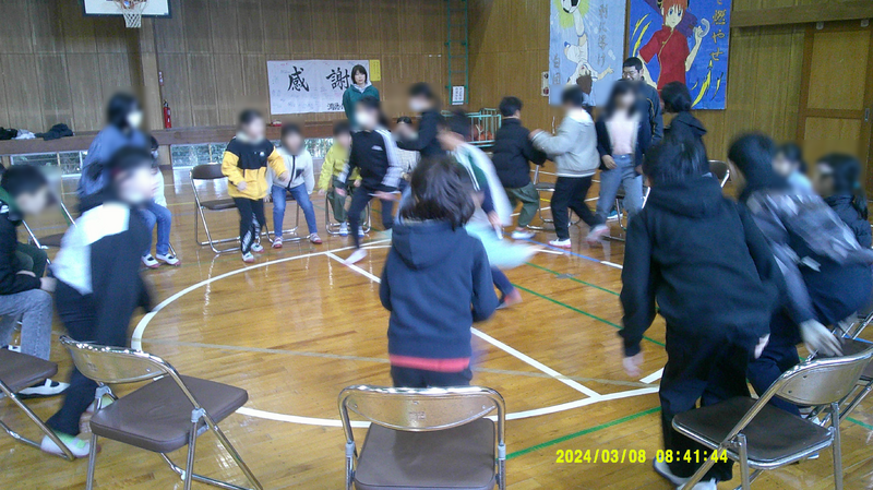 11:00から山都(職員室)、日野(校長室)でオンラインで最後のコラボを行いました。年度末ですので全員はそろいません。出勤した職員でやろうということで実施しました。