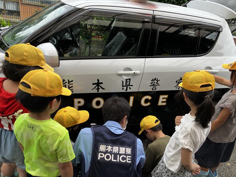 パトカーの周りに集まりました。間近で見るのは初めてだったことでしょう。