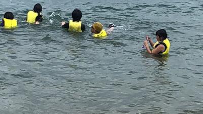 1・2年生チームと3年生チームでプール内の外周りを歩いて競争。相手チームに追いついたチームが勝ちです。3年生チームの貫禄勝利!