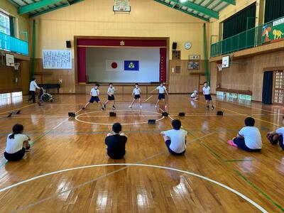 まず、全児童のタブレットに送った動画を児童が各自のタイミングで見て練習します。その後、全てのタブレットに一斉配信し、同じタイミングで練習しています。少しずつですが、ダンスが得意な友だちに教えてもらいながら頑張っています。