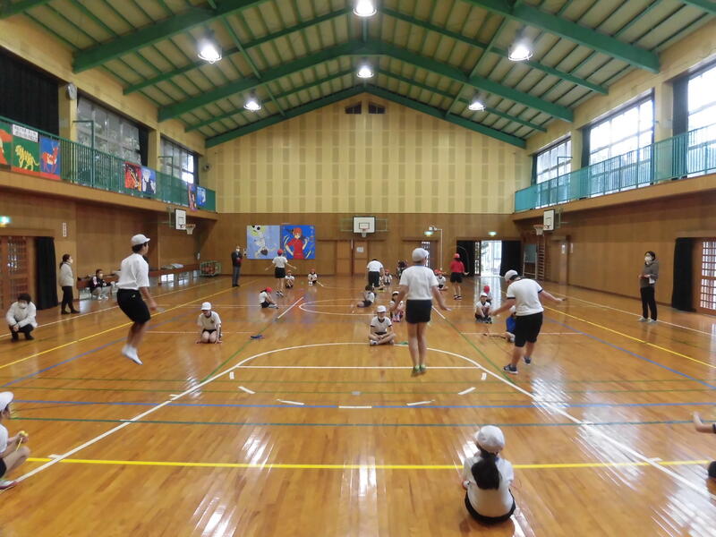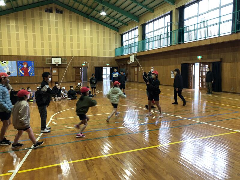はじめのあいさつで、日本記録(1分で250回跳び)の話をすると、子どもたちはかなり驚いていました。それはそうです。1秒間に4回以上跳んでいるわけですから別世界です。子どもたちには、今日のポイントは「思い切り」と「タイミング」だよということを強調しました。