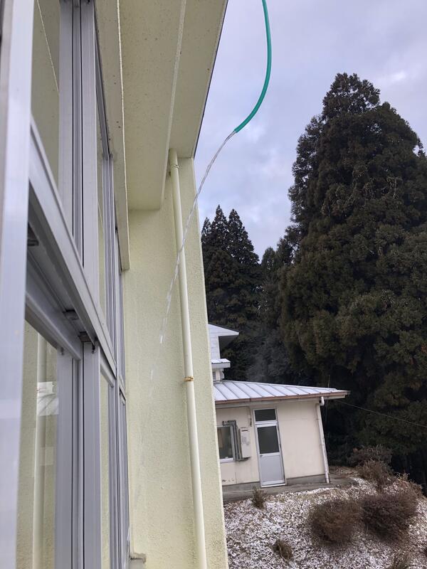 しばらく時間がたってからの写真ですのでわかりにくいと思いますが、2階の水道は凍結防止のため、凍結しそうになると1本の水道から水が流れる仕組みになっています。ところが、配水管が凍ってしまうと水が溜まってしまいます。今日はまさにその状況になったわけです。放っておけば、水があふれて廊下が大変なことになります(;゜ロ゜)大ピンチ!!!