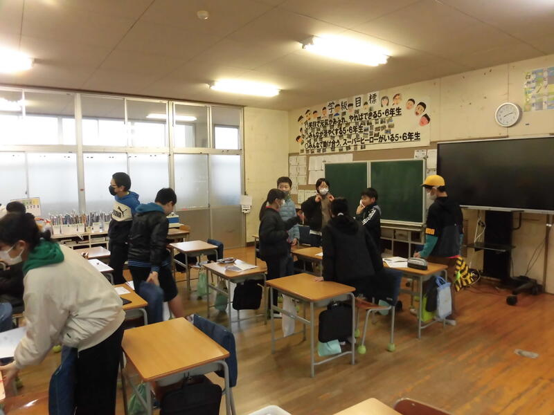 今回は、5年生交流ですので6年生にはカメラに入らない範囲のところに移動してもらいました。6年生協力ありがとう!!また3年生は今後の交流に備えて様子を見学に来ていました。このように、いつでも複数学年が集まれるのが小規模校の強みです!!