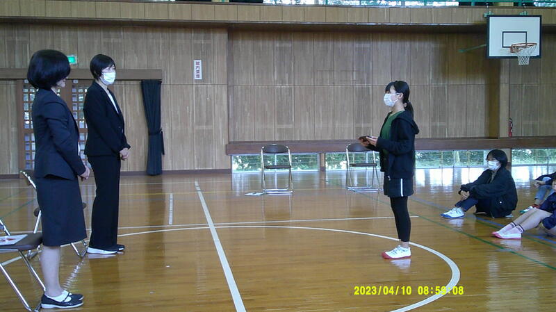 新入生氏名点呼の場面です。この中に、本校卒業生が3名映っています(^_^) 誰でしょう?どこにいるでしょう?わかった人は校長先生まで伝えに来てください・・・ってか、卒業生は私が来ていたの気づいてたのかなあ?※Tくんとは直接トイレ前で会えました!