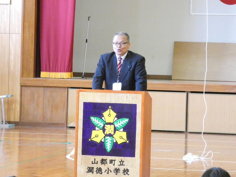 来賓あいさつで、潤徳小閉校や東京潤徳小・矢部小との交流、HP閲覧についてお話ししました。学校の様子を伝える貴重な機会です。ちなみにこの日の来賓は5人。私は3番目の登場でした。冒頭に繰り出した「自己紹介ギャグ」もウケてよかったです(^▽^)