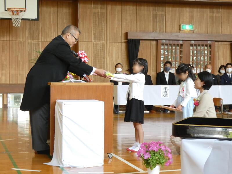 入学祝い品授与。ここでは、校長から教科書と黄色いかさを代表児童に渡しました。
