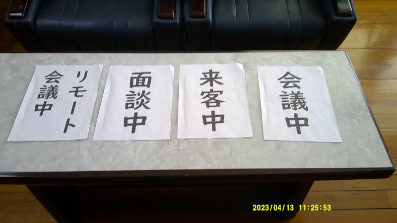 具体的には、こういった紙をドアに提示します。ただ・・・「電話中」カードは用意していませんでした!!