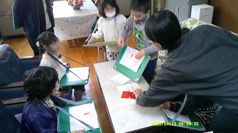 入室ができたら、スタンプを押してもらいます。この後もいろいろな教室を回ります。いわゆる「スタンプラリー」方式です。