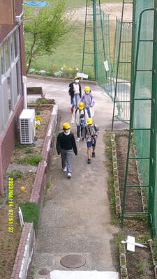 本日4月14日は、熊本地震「前震」の日。上益城管内は本日を「かみましき いのちと防災の日」と位置づけ、各小中学校で集会や避難訓練を実施しています。本校では、放送によりシェイクアウト訓練→避難→集会講話という流れで実施しました。