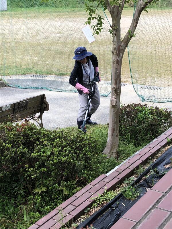養護教諭の増田先生です。時間を見ては電動草刈りをされていました。本校は、このようにフットワークの軽い先生がいます。本当にありがたい存在です。