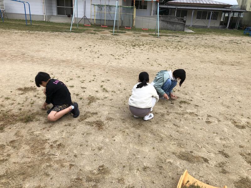 さて、今日朝から私が運動場で草取りをしていると、登校後すぐにこちらに大声で挨拶をして教室に荷物を置くと、3人の子がやってきました。