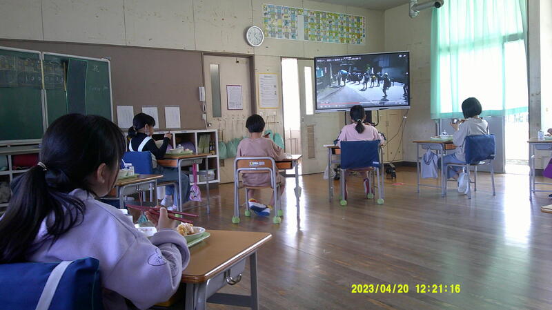 3・4年生教室の様子です。給食を食べながら中継を視聴しました。いつものことですが、学年の人数に圧倒されていました。