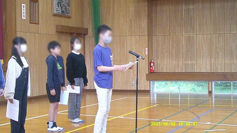 合同全校朝会を明日に控え、集会担当の児童どうしでリハーサルを行いました。