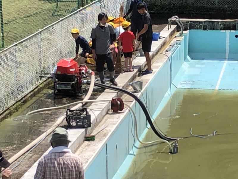 本校のプール掃除では、毎年消防車のポンプをお借りしています。本校には、大きなプール用水道も排水溝もありません。安全面ではいいばかりですが、水入れ・掃除のときは大変です。
