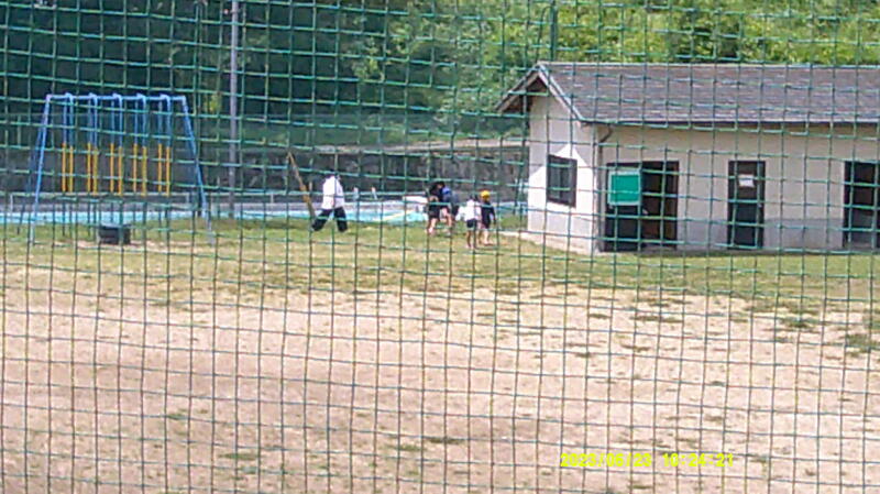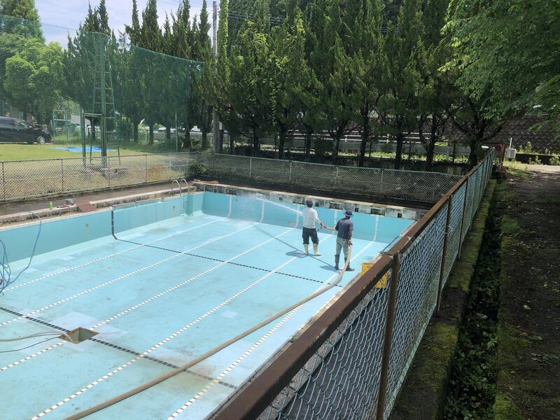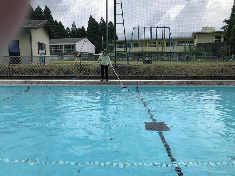 その後、地域からプール掃除の協力に1人来ていただきました。まだ1時間以上あるのですが、早めに来ていただきました。朝から「プールの水が出ない」騒ぎになっていたので、その対応にも協力していただきました。