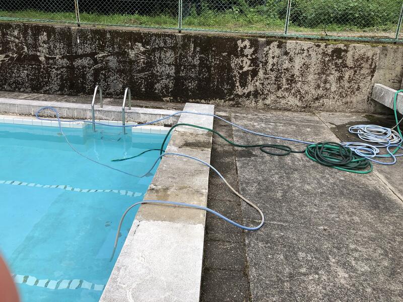 雨天のため、1日延期したプール掃除。今日はすばらしい天気になりました。スタート時の光景です。周りは草ボーボー、プールの中も汚れが目立ちます。