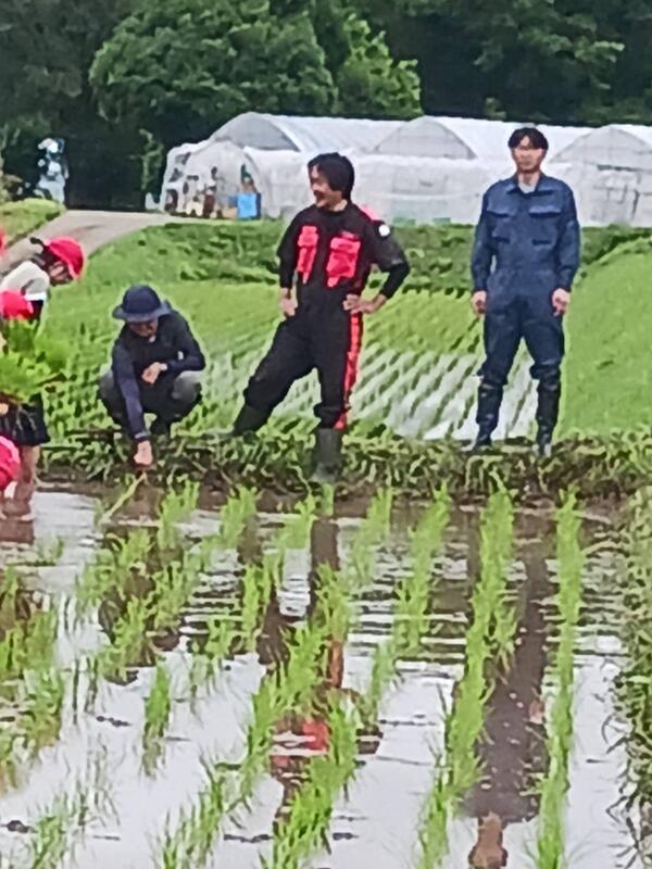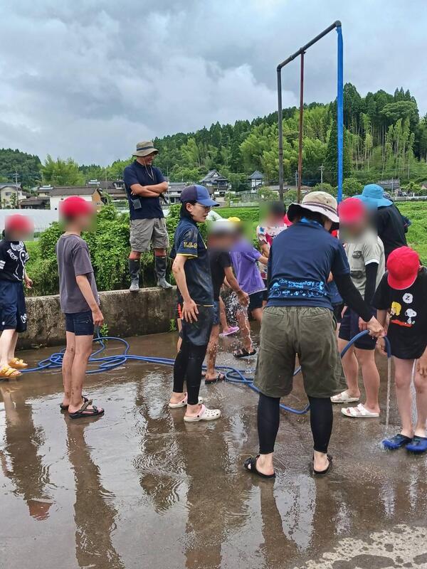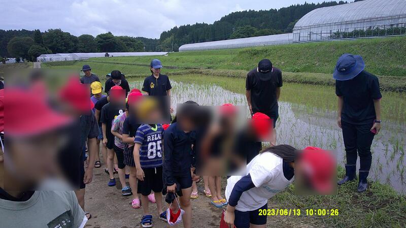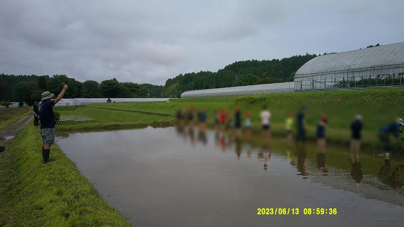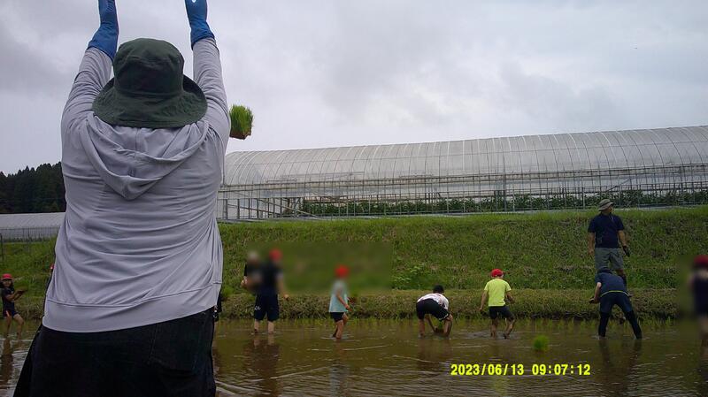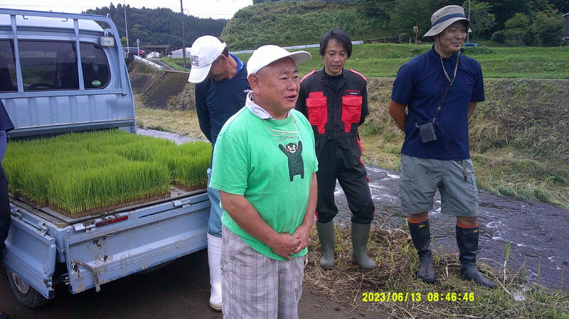 田んぼのオーナーである八田さんから田植えの方法を説明してもらいました。「有機農業で有名な山都町。こんな地域は他にない。あなたたちは幸せな子どもたちです。農家の方はこんな思いで米を作っているんだな。山都町の良いところをしってもらう。そんなことを思いながら日ごろのご飯を食べてほしい」と力説されました。