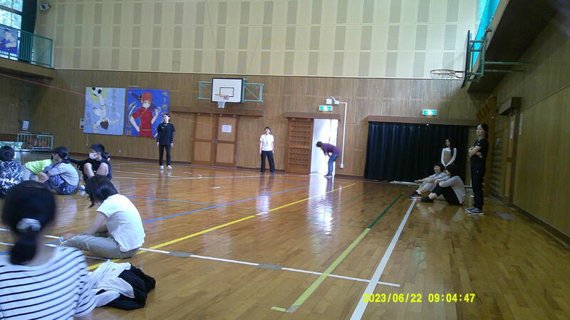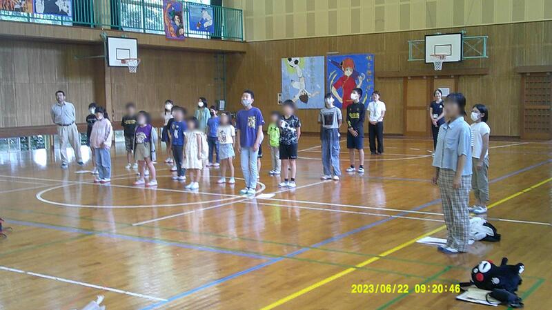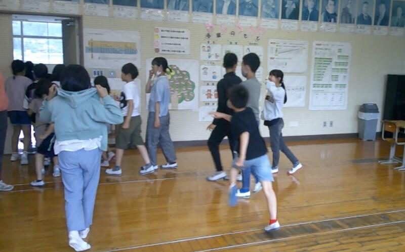 今日から、4年生以下の子どもたちも合流します。体育館でリズムを取る練習をしました。