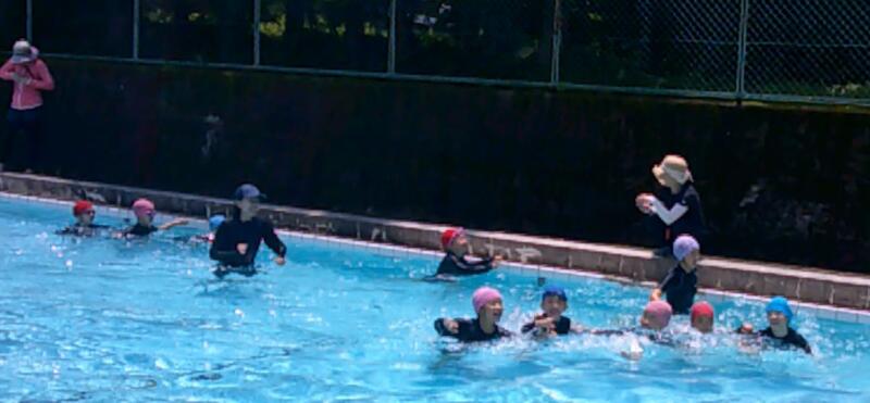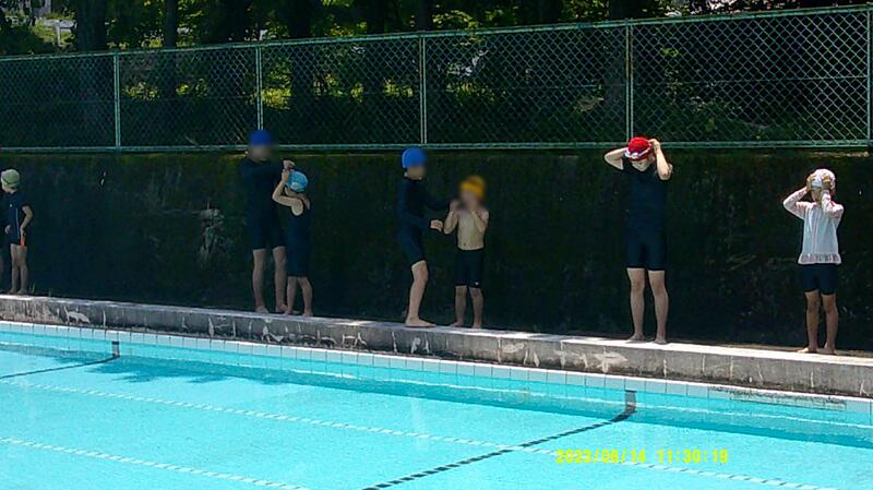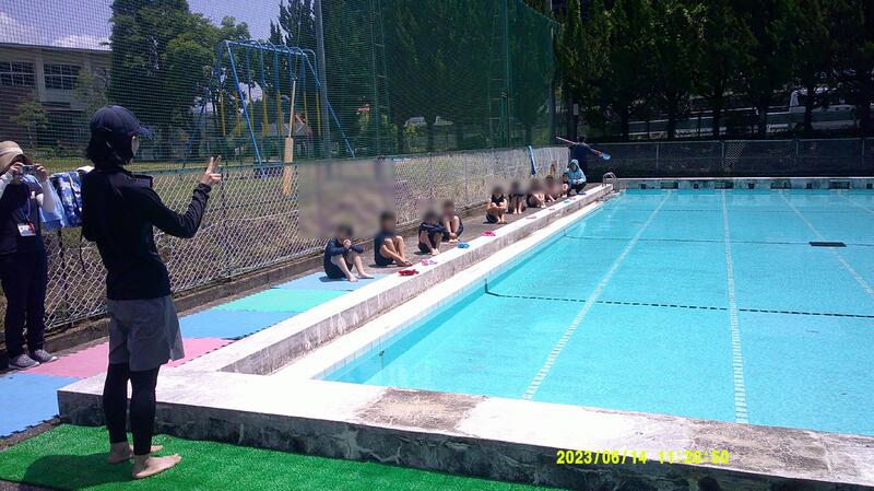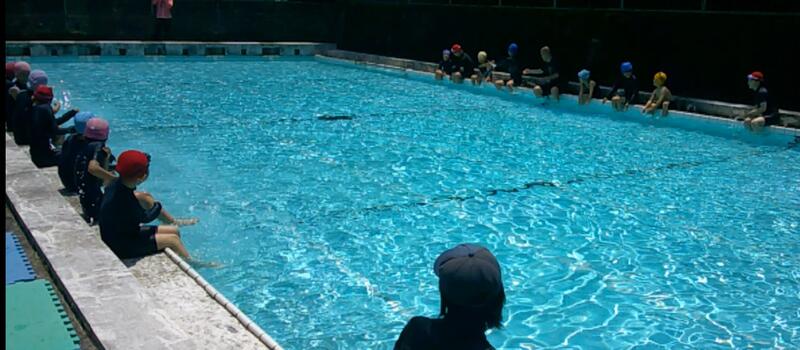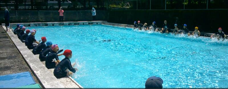 「放送席~ 放送席~ こちら、1・2年生の水泳授業(忍者修行)の現場に来ています!今からリポートします!!」
