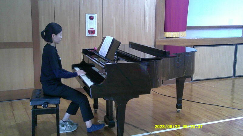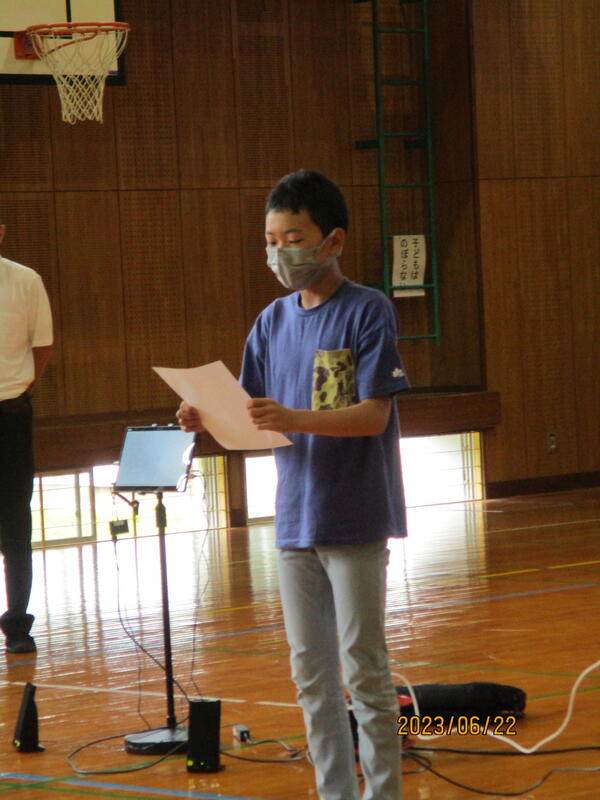 校歌斉唱。今日は森Tの伴奏デビューでした。先生がピアノの方に歩いて行こうとすると、自然と子どもたちから拍手がわき「がんばれ~」と声がかかっていたのがほほえましかったです(^▽^) 先生が朝早くから1人、体育館でピアノ演奏の練習をしていたのを私は外で草取りをしながら聴いていました!