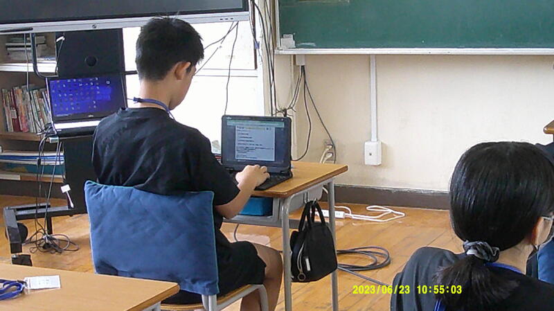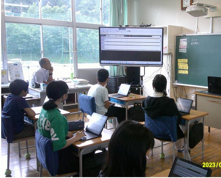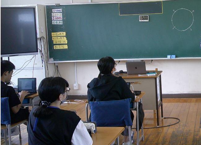 本校では各クラスで交流サイトにアクセスしました。画面が4つあるのは日野(ホスト)と本校3クラスで4つの画面が映っています。