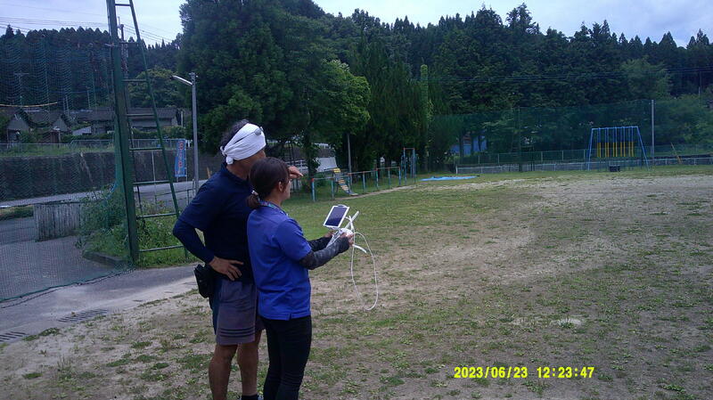 閉校記念事業実行委員会のメンバー高宮さんは、いろんなところにパイプをもっておられる貴重な存在で、実行委員のキーパーソンでもあります。今回は、専門家同伴でドローン撮影にやってこられました。