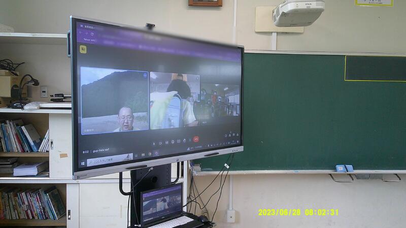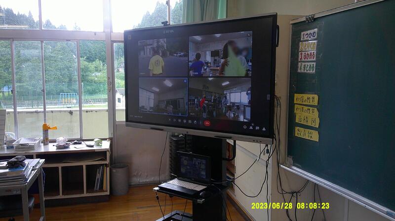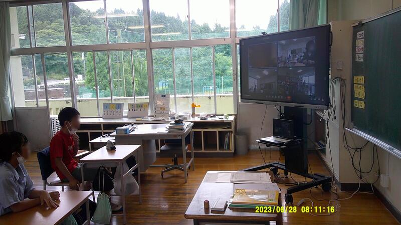 本校では各クラスで交流サイトにアクセスしました。画面が4つあるのは日野(ホスト)と本校3クラスで4つの画面が映っています。