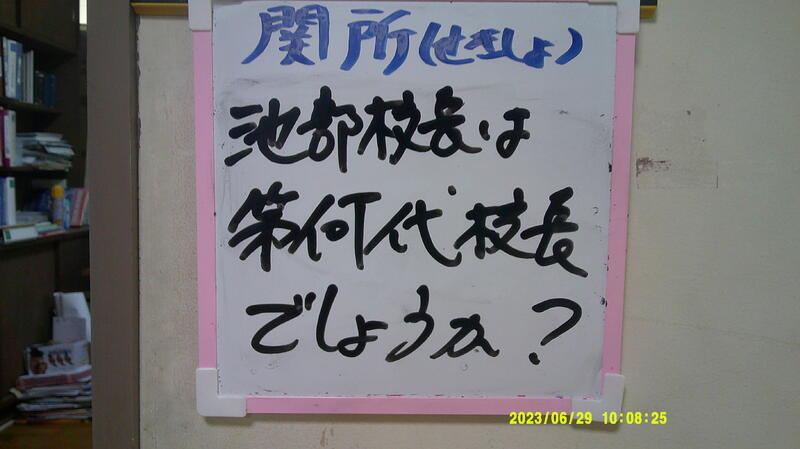 4年生のMさんでした。彼女は1発で「7代目です」と正解でした。「何で知ってるの?」と聞くと「何となく覚えていました」と答えてくれました。私は、3月の卒業式および4月の入学式のそれぞれの式辞の最後で「山都町立潤徳小学校 第7代校長 池部聖吾智」と言ってました。まさかそれを覚えていてくれたとか???だとしたらスゴイですね(^▽^)