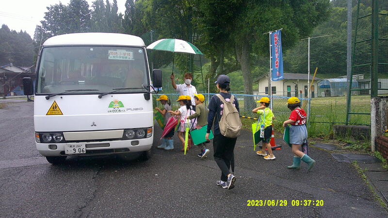 1・2年生が地元の下名連石駐在所に見学に行きました。ニコニコしてバスに乗り込んでいます。