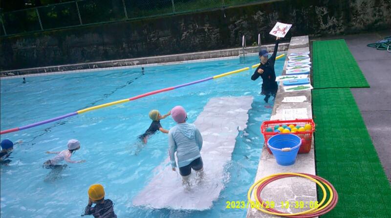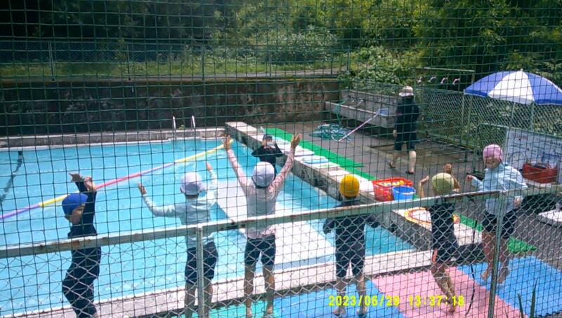 「放送席~ 放送席~ こちら、1・2年生の水泳授業(忍者修行)の現場に来ています!今からリポートします!!」