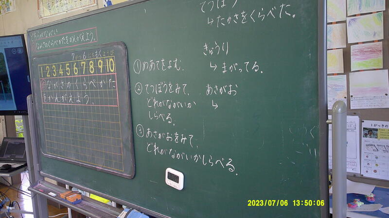 1学期に頑張ったことは、「3つの挑戦」として4月に決めた目標がどうだったかを振り返りました。読書や水泳、挨拶などを目標にしている児童はしっかり取り組めたようです。終業式では代表の児童が全校児童の前で発表することになっています。