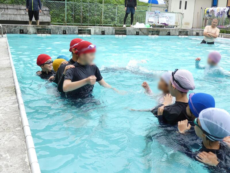 上の写真は、足を伸ばして溺れている子につかまらせ、みんなでひっぱりあげている様子です。決して1人では無理をせず、周りの人に助けを求めることで自分も安全に助けることができました。