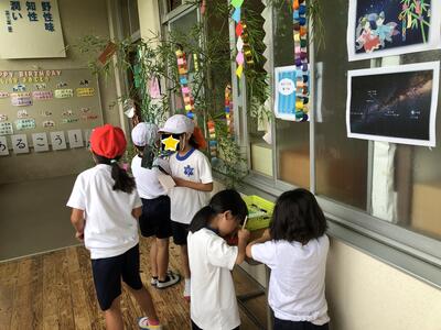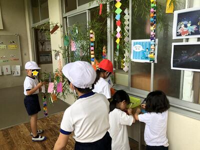 教頭先生と小田原先生が竹を用意して、廊下にすてきなたなばたコーナーができあがりました。