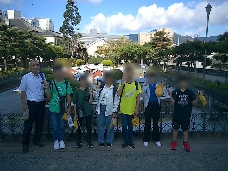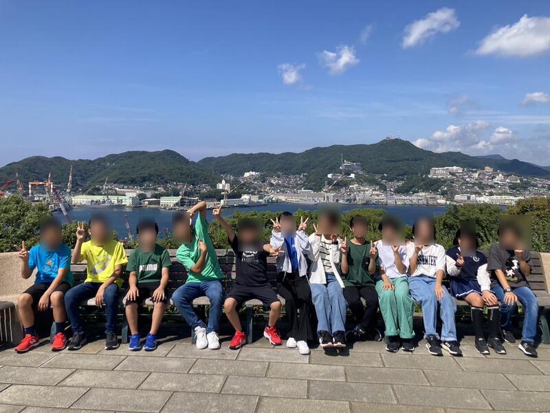 出島から班別研修をスタートしました。まずは集合写真から。