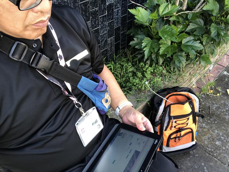 電車通りの日陰でHPアップ作業中の校長。lineからデータが続々と入ってきます。取り込んでコピペしてボカシを入れて、自撮りもして・・・これが舞台裏です。マスコミ役もこなしてます笑笑