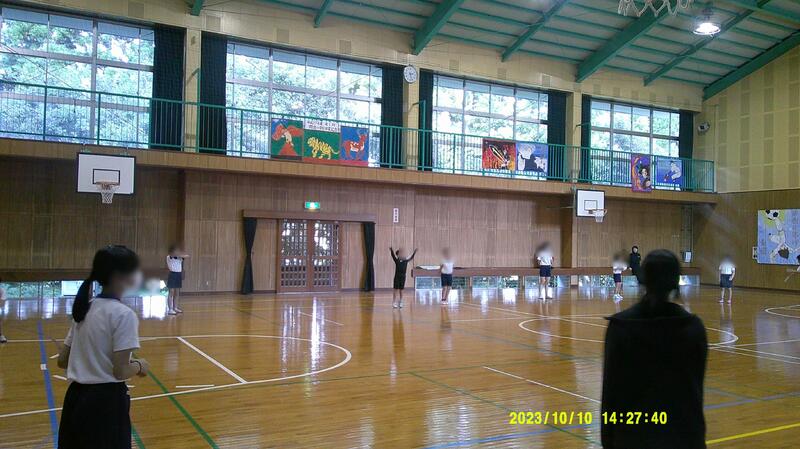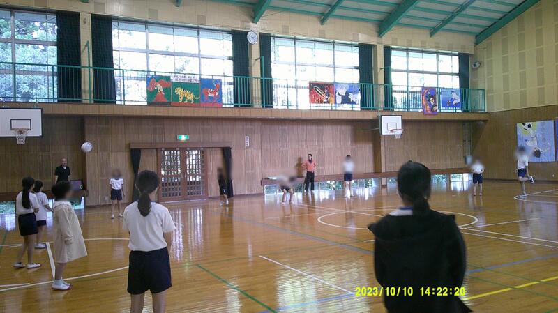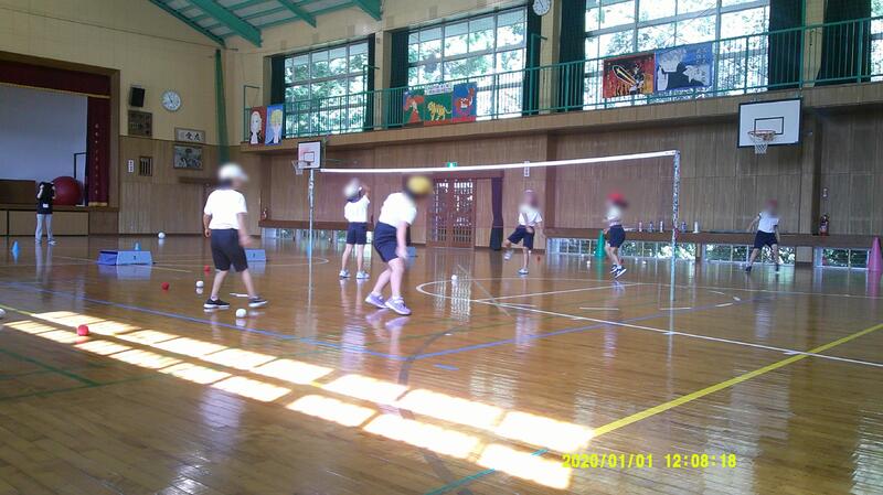 体育館では、バドミントンコートで運動会種目「玉入れ」用の紅白玉20個を使って相手コートにいかに多く投げ入れることができるかというゲームに取り組んでいました。本校の課題である投力を鍛え、さらにバレーやバドミントンにつながる面白いゲームだと思いました。