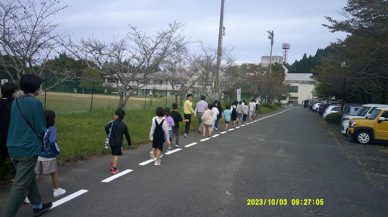 矢部中学校の敷地内に入りました。「(グラウンドが)大きい!」という低学年の子の声が聞こえました。
