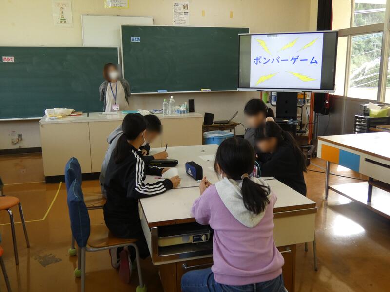 まずは、ボンバーゲームからスタートしました。先生と同じ答えを書いた人は座り、最後まで残ったひとが勝ちです。