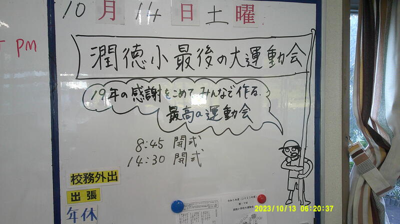 今日、僕はソフトボール投げとリレーに出ました。リレーでは、みんなと協力して走れたし、ソフトボール投げでは自分の全力を出せました。そして僕が通っている潤徳小学校は今年度で閉校です。閉校は寂しいけどみんなで協力できたり自分の全力を出せたりした今日のこの郡陸はぼくのいい思い出に残りました。
