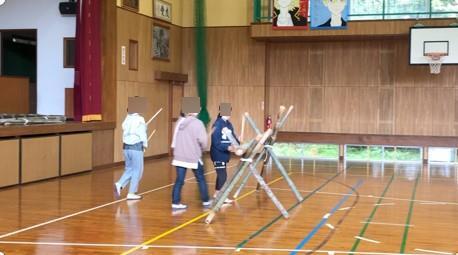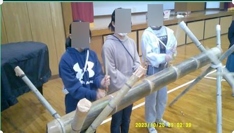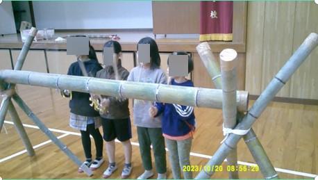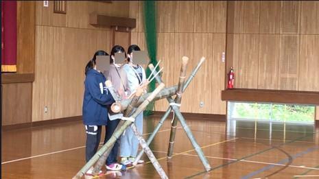 ウォーキングを終えて、横になって一休みしていると女子の声が聞こえてきました。しばらくして「お疲れ様です」と声をかけてくれたのが6年女子3名でした。遊びに来たのかと思いきや、竹ドラムをセットして練習を始めました。