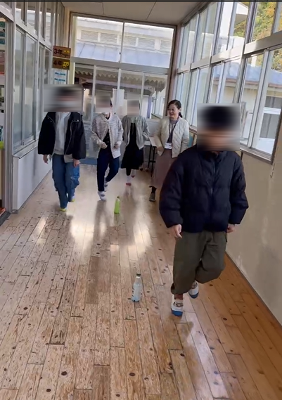 最後に、廊下に出てケンケンパを体感してもらいました。子どもたちは「そんなに遠くまで!ケンケンパをしながら!」ということを実感。物語の世界に深く入り込むことができました。