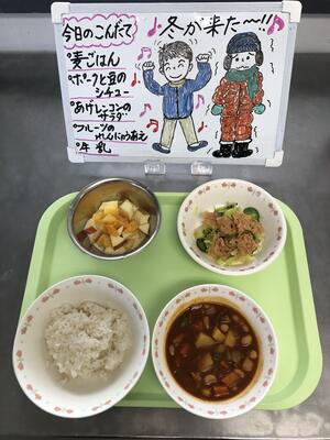 今日は予定どおりの水曜日のメニュー!まず私が最初に食したのは・・・・もちろん野菜ファーストで「ちゅうかサラダ」。昨日同様、このサラダと容器の冷たさから給食室で調理されているお2人に思いを馳せました。冷たくても具だくさんおいしい!!そして、寒い日にぴったりの「チゲなべふう」キムチとはくさいのコンビが鍋好きの私には魅力的です!!そして、デザート「フルーツしらたま」で締めました。今日もお腹も心も満腹でした。(今日も校長、絶好調~♪)